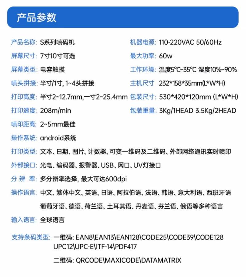 ![]() ![]() ![]() ![]() ![]() ![]() ![]() ![]() ![]() ![]() ![]() ![]() ![]() 高端在線工業(yè)噴碼機(12.7mm.單噴頭) 電容式觸屏,達到手機觸摸的體驗感,安卓系統(tǒng).支持全球文字的噴印,且切換簡單,網(wǎng)絡云端升級,支持全球機器的定制,只需在本國聯(lián)網(wǎng)升級即可,操作簡單,功能強大,且支持外部實時數(shù)據(jù)噴印。 實時可變數(shù)據(jù)噴印,可變二維碼,條形碼,物品外包全自動賦碼,防偽,追溯碼,一物一碼。支持數(shù)據(jù)庫,外部Excel表格數(shù)據(jù)導入,自動生成二維碼,即輸即得,一掃便知,提高生產(chǎn)效率,節(jié)省標簽成本。 7寸電容屏,最快208米/分,九種組合 穩(wěn)定高效,防擦防水,支持定制,數(shù)據(jù)可變,成本可控,計數(shù)變量,多噴頭無縫拼接,獨立噴碼。 |