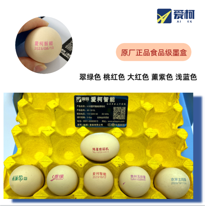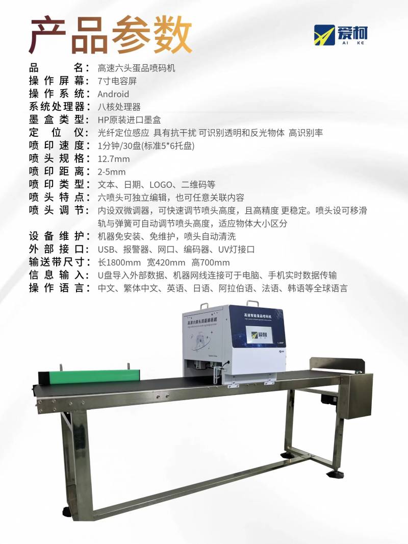 愛柯新一代雞蛋噴碼機,采用8核處理器,光纖定位感應,具有抗干擾性,可智能識別透明和反觀物品,高識別率能隨意檢測各種蛋品。標配惠普原廠墨盒,600dpi噴印更清晰,一分鐘最快可噴印30盤標準托盤雞蛋。噴印字體點陣,實體都可隨意切換。六個獨立噴頭可獨立編輯也可組合編輯,內設雙微調器,可快速實現噴頭高度上下調節,每個噴頭都配有彈簧和擋片能更加有效的防止雞蛋刮碰。